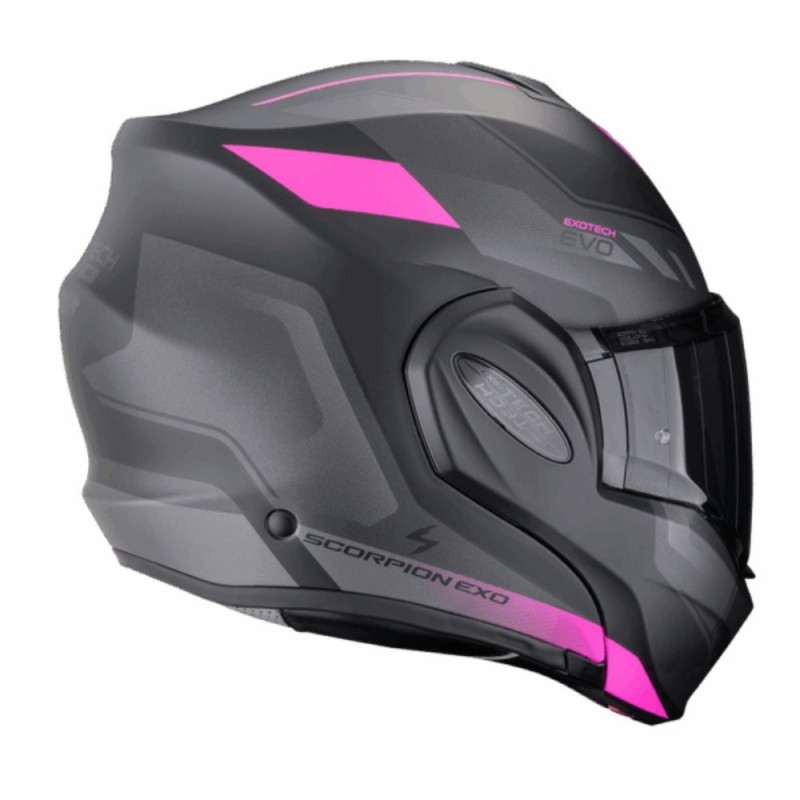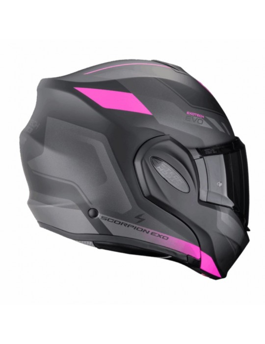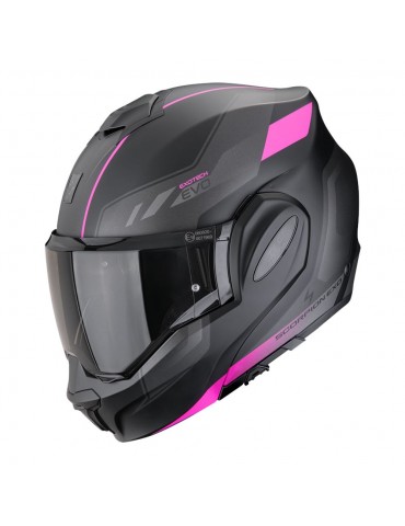 Capacete SCORPION EXO-Tech Evo Socius preto fosco / rosa. O Scorpion EXO-Tech EVO Socius é um capacete modular de nova geração com design desportivo e homologação dupla P/J, ideal para quem procura versatilidade e segurança na estrada e na cidade. A sua calota compacta de baixo volume oferece aerodinâmica otimizada e máximo conforto em viagens longas.