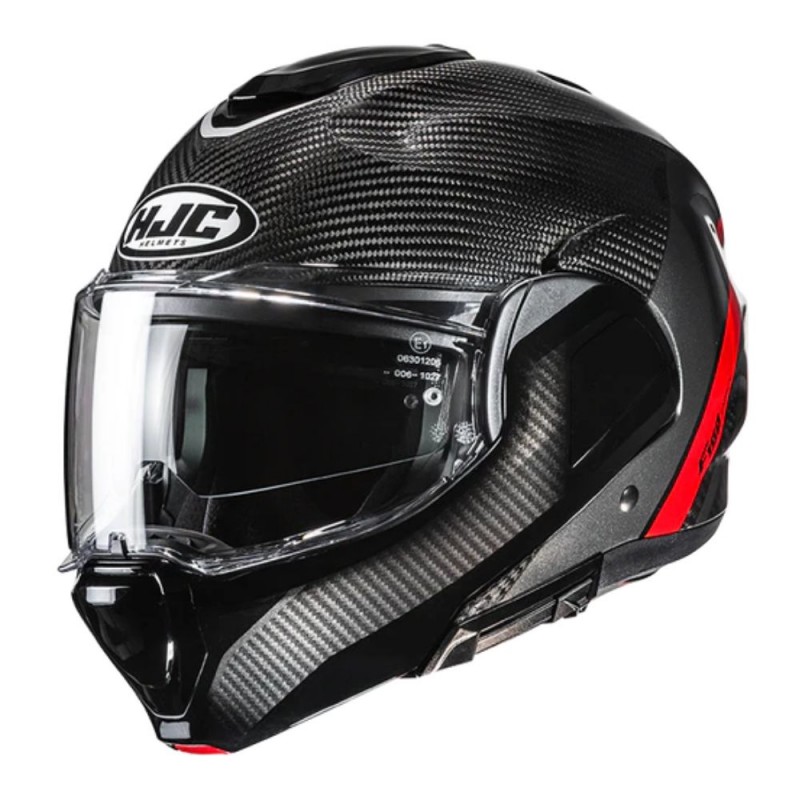 Capacete HJC F100 Carbon Stan MC1. O F100 Carbon é um capacete leve e resistente com calota em fibra de carbono, ventilação ACS avançada e viseira solar escura integrada. Incorpora viseira HJ-45 com proteção UV 99% e preparação para Pinlock®. O seu interior é removível, lavável e adequado para óculos. Possui fecho de micro fivela para maior segurança e conforto.