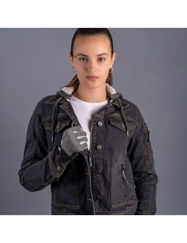 Casaco LS2 OAKY Lady preto. Casaco de ganga de estilo urbano com capuz de algodão amovível. Fecho de correr duplo e botão para uma ventilação e um ajuste perfeitos. Protectores amovíveis nos cotovelos e ombros.