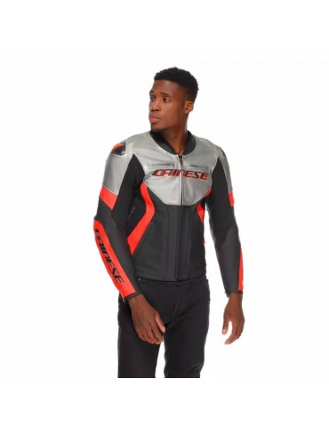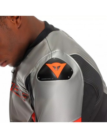 Casaco DAINESE Racing 5 prata / preto / vermelho flúor. O Racing 5 é um casaco de motociclismo desportivo de ajuste regular, fabricado em pele de vaca Tutu com 1,2 mm de espessura. A preocupação com a ergonomia levou a estudos das posições de condução para aperfeiçoar os pormenores.