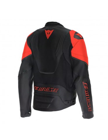 Casaco DAINESE Racing 5 preto / preto / vermelho flúor. O Racing 5 é um casaco de motociclismo desportivo de ajuste regular, fabricado em pele de vaca Tutu com 1,2 mm de espessura. A preocupação com a ergonomia levou a estudos das posições de condução para aperfeiçoar os pormenores.