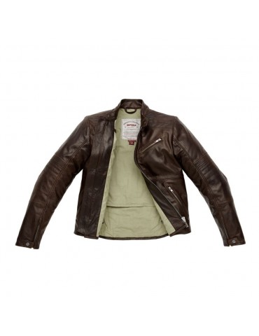 Caasaco SPIDI Garage castanho. É um casaco de couro com um desenho clássico, equipado com a inovadora protecção Warrior-Lite que maximiza o conceito de protecção e conforto. O couro bovino italiano é maravilhosamente acabado e macio ao toque. Detalhes como os zips YKK agressivamente angulados remetem para as origens clássicas das motos.