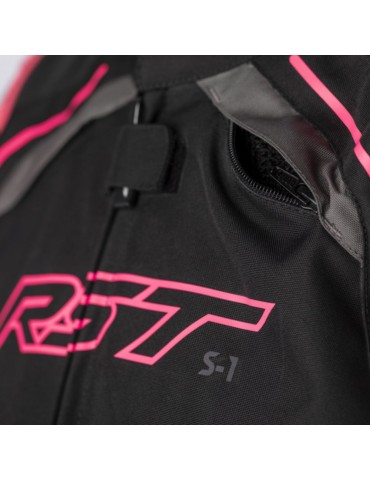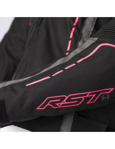 Casaco RST S-1 Lady preto / rosa / cinza. Simplesmente concebido para o máximo desempenho. O casaco de tecido S1 apresenta ombros e cotovelos de nível CE 1 combinados com uma gama de materiais de alta tecnologia. Revestimento impermeável SinAqua, forro térmico e aberturas de admissão e escape para o manter seco, quente e fresco.