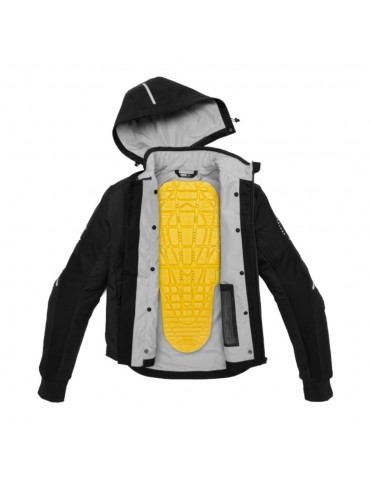 Casaco SPIDI Hoodie Armor H2out preto / branco. O inovador casaco de design pronto a viajar consigo todos os dias, em todas as condições climatéricas, dentro e fora da bicicleta. O casaco certificado CE classe A prEN 17092-4:2017 tem um capuz destacável, armadura Warrior Lite CE Nível 1 sobre ombros e cotovelos e protetor opcional de costas Warrior (CE Nível 1 En 1621-2:2012).