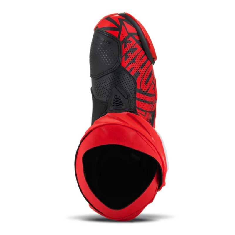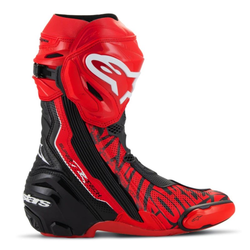 Botas ALPINESTARS Supertech R Vented Edição Limitada Pecco Bagnaia vermelho / preto. Lançadas em 2025 e projetadas para uso em estradas, as botas ventiladas Pecco Bagnaia Supertech R LE oferecem ventilação ideal e controle preciso, perfeitas para pilotagem em pista no verão. Com certificação CE EN13634:2017, elas combinam microfibra perfurada a laser, uma placa de TPU redesenhada para a canela, sliders substituíveis e uma bota interna biomecânica em malha 3D para absorver impactos e otimizar o fluxo de ar. Um painel elástico em TPU, um sistema de fechamento micrométrico e uma sola de borracha aderente garantem suporte e conforto ideais nas pedaleiras.