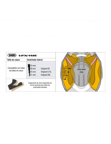 Substituição SHOEI VFX-WR. Forro lateral para o capacete Shoei VFX-WR. A espessura do forro é medida em milímetros. Os tamanhos mais finos são utilizados para um ajuste mais pequeno, os tamanhos mais grossos para um ajuste maior. Todos os tamanhos de estofo são compatíveis com todos os tamanhos.