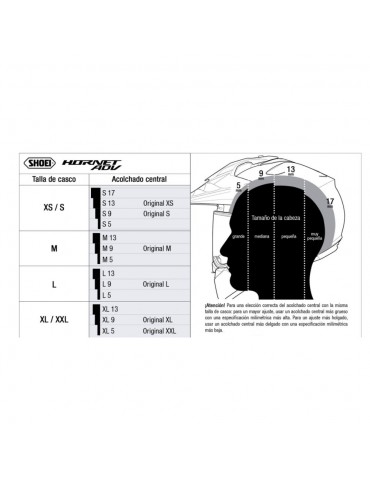 Substituição SHOEI Hornet ADV. Forro central, a espessura do estofamento é medida em milímetros. Os tamanhos mais finos são utilizados para um ajuste mais pequeno, os tamanhos mais grossos para um ajuste maior. Verificar a tabela de tamanhos para cada estofo.