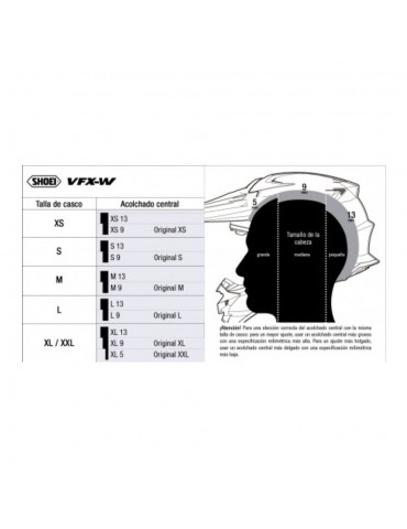 Substituição SHOEI VFX-W. Forro central para o capacete Shoei VFX-W. A espessura do forro é medida em milímetros. Os tamanhos mais finos são utilizados para um ajuste mais fino, os tamanhos mais grossos para um ajuste mais apertado. Verificar a tabela de tamanhos para cada estofo.