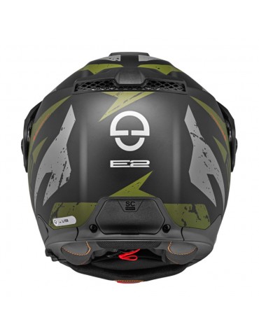 Capacete SCHUBERTH E2 Explorer verde fosco. O SCHUBERTH E2 é a mistura perfeita entre o conforto da conhecida série de capacetes "C" flip-up e o aspecto robusto de um capacete todo-o-terreno. O novo E2 cumpre todas as normas actuais da SCHUBERTH em termos de segurança, aerodinâmica e aeroacústica. O escudo do E2 foi desenvolvido no próprio túnel de vento de SCHUBERTH para minimizar as vibrações e choques. Com o E2, SCHUBERTH oferece aos seus clientes de serviços múltiplas configurações de capacetes: a tampa pode ser ajustada em 3 situações e é também facilmente removível. A segurança vem em primeiro lugar na SCHUBERTH. Com o E2, SCHUBERTH apresenta o seu primeiro capacete com aprovação P/J e ECE 22.06. Isto inclui um novo invólucro de fibra de vidro com tecnologia patenteada Direct Fibre, reforçada com carbono para aumentar a absorção de choques e reduzir o peso.
